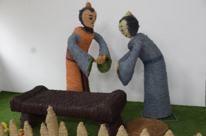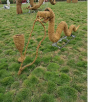 2.中間環(huán)節(jié):以結(jié)構(gòu)件的基礎(chǔ)上用稻草繩做纏繞編扎,用草繩包住整個(gè)結(jié)構(gòu)件, 形成稻草工藝品的外在表象,期間用細(xì)鐵絲或麻繩固定。編扎的細(xì)致、接 頭的固定方式?jīng)Q定稻草工藝品的外觀質(zhì)量。